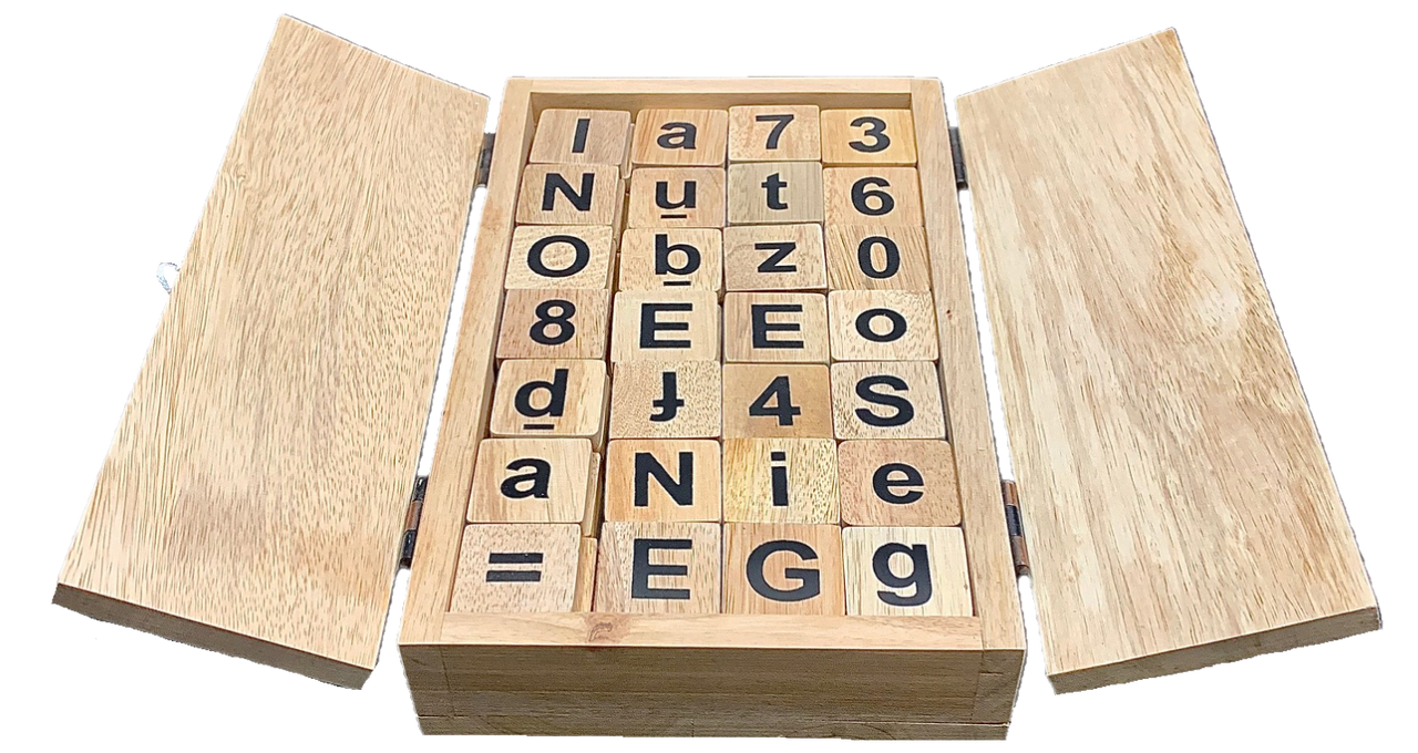 Een kleinere doos letters en nummers voor het vormen van woorden en leren rekenen.
