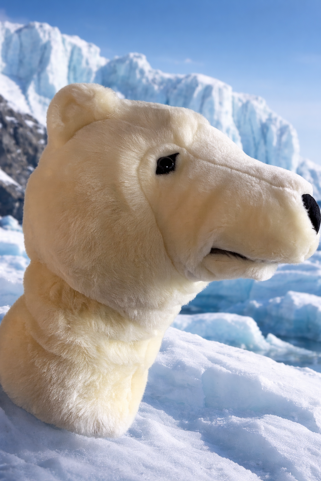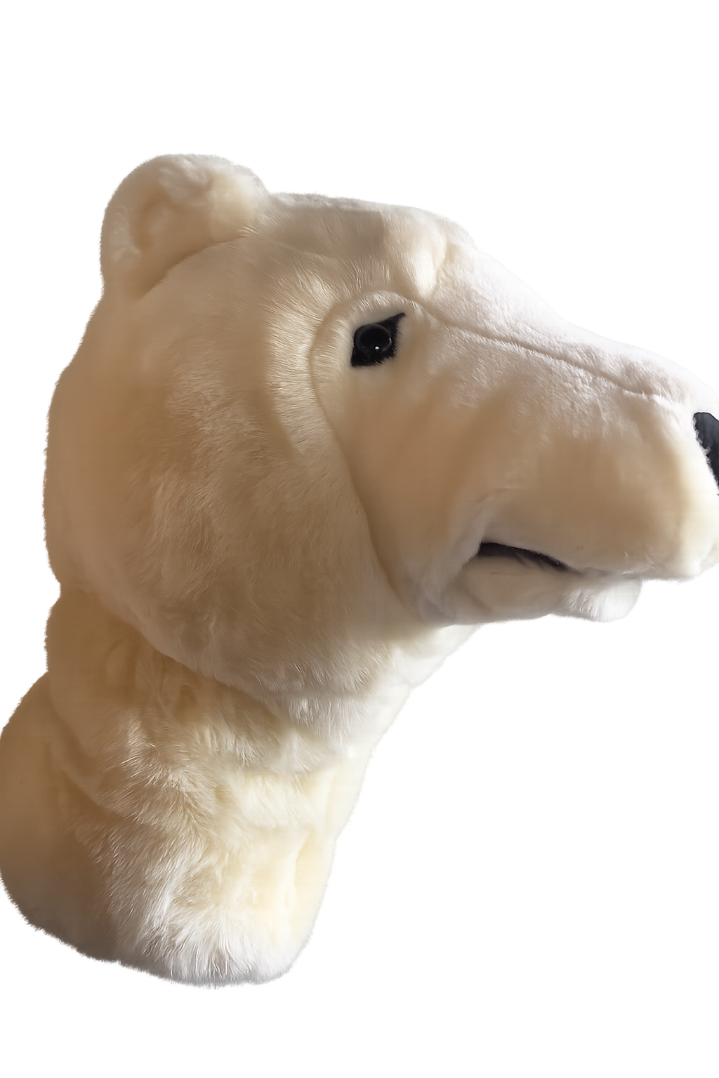 Een reuzen handpop van het hoofd van een ijsbeer van ca. 45 cm van mooi pluche gemaakt. Van het massieve hoofd kan de mond bewogen worden. Ook als "trofee" opgehangen aan de wand is de handpop spectaculair.