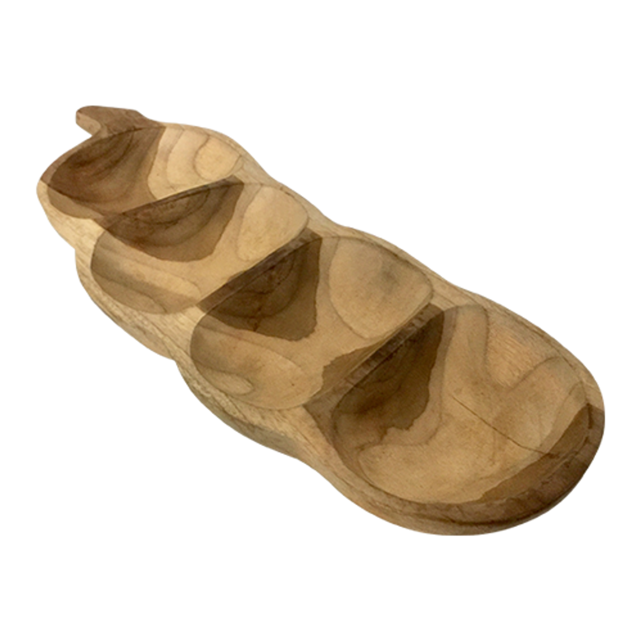 Deze kom in de vorm van een tamarinde is gemaakt van suarhout en heeft vier compartimenten.
