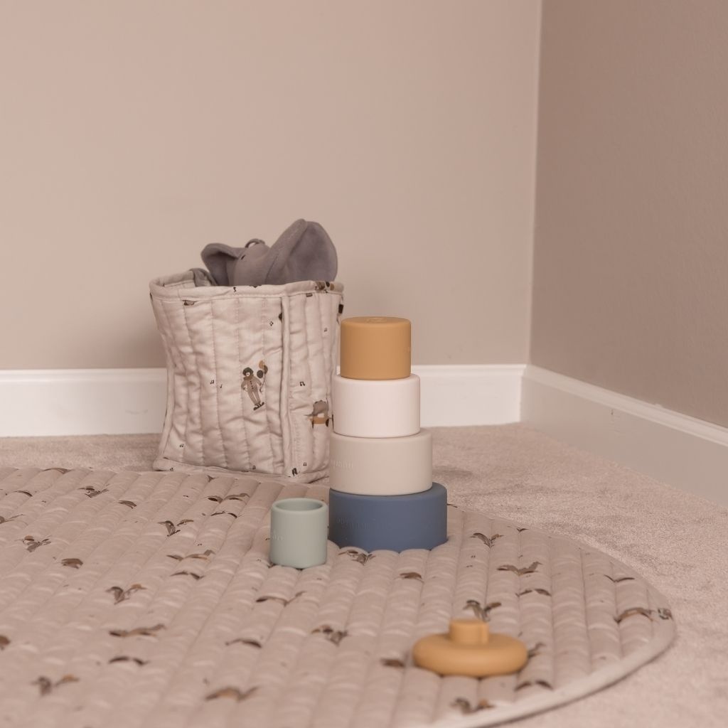Leuke stabiele toren om de hand-oogcoördinatie en motoriek van het kind te trainen. De toren is gemaakt van zachte siliconen en is in neutrale kleuren - wanneer hij niet in gebruik is, is hij een mooie decoratie voor de kinderkamer.