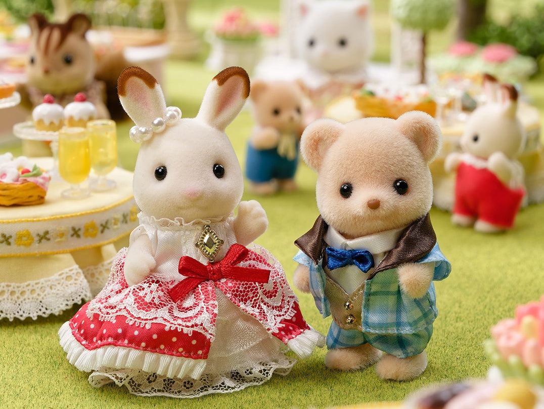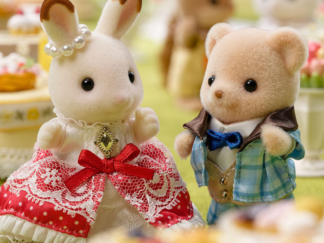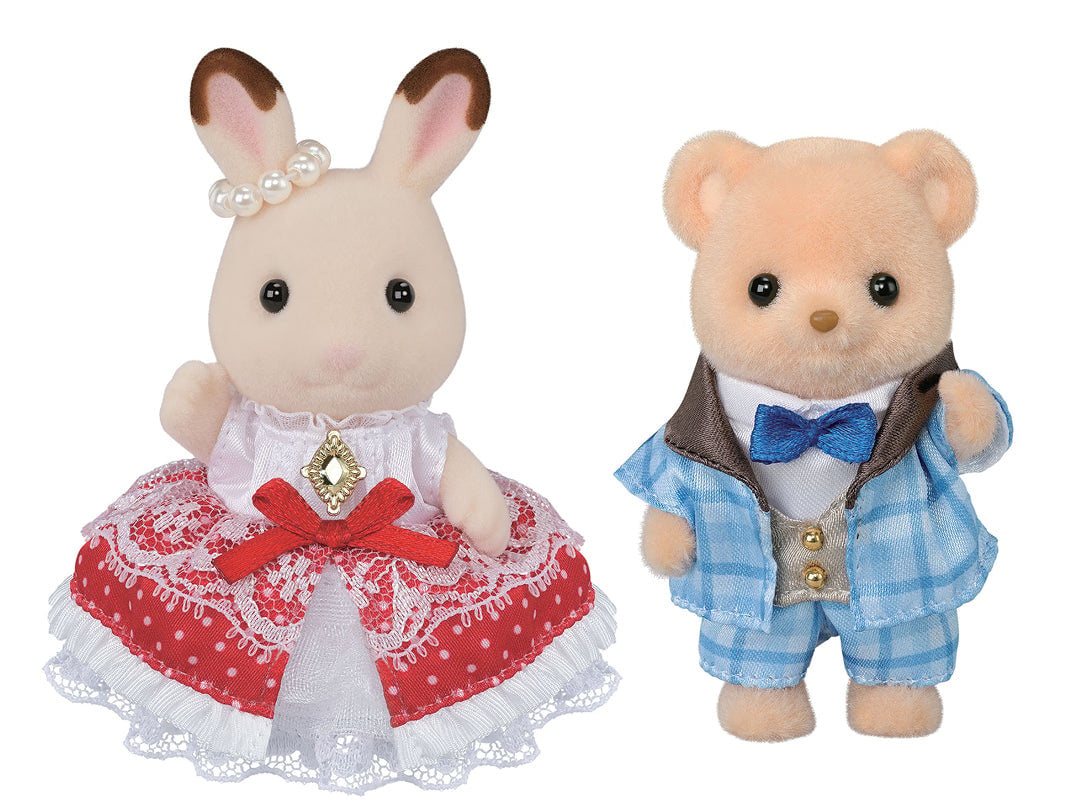 - Deze figurenset toont Freya, het Chocolade Konijn-meisje, en Theo, het Koekjesbeer-jongetje, gekleed in prachtige kleding.