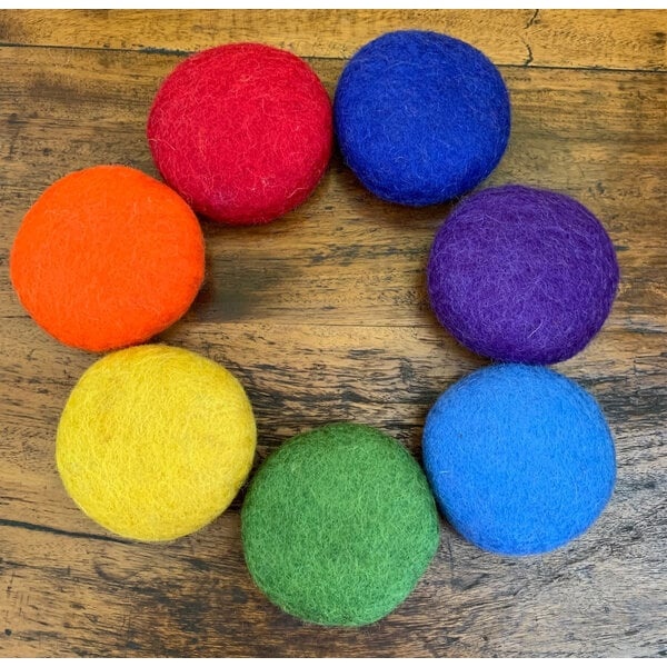 De set bevat 7 viltballen, één in elk van de regenboogkleuren en deze past bij alle andere regenboogproducten die we verkopen. Adviesleeftijd 0+